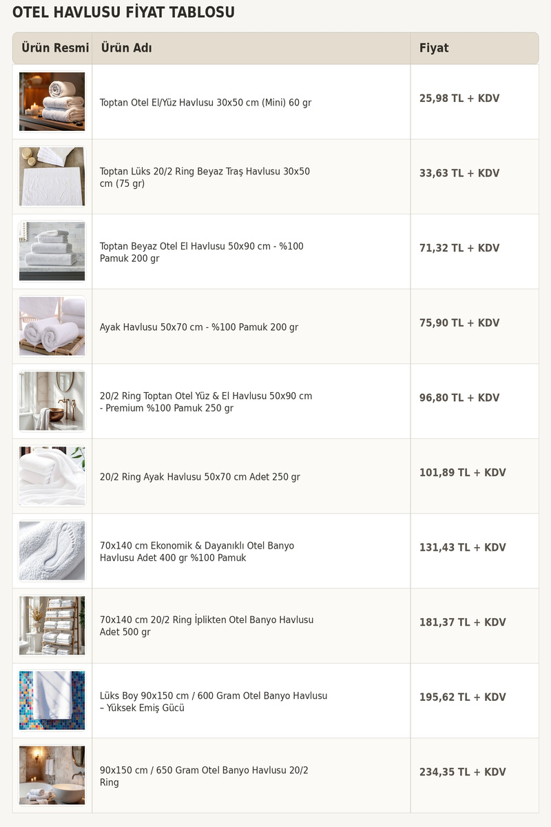 Üreticiden doğrudan temin edilen toptan otel havlusu seçeneklerimiz, işletmelere maliyet avantajı sağlar. Farklı ölçü ve gramaj alternatifleri ile sunulan ürünlerimizde otel havlu fiyatları, sipariş miktarına ve ihtiyaca göre belirlenir. Logo nakışlı üretim, yüksek adetli sipariş ve hızlı teslimat seçenekleriyle projelerinize özel çözümler sunuyoruz.