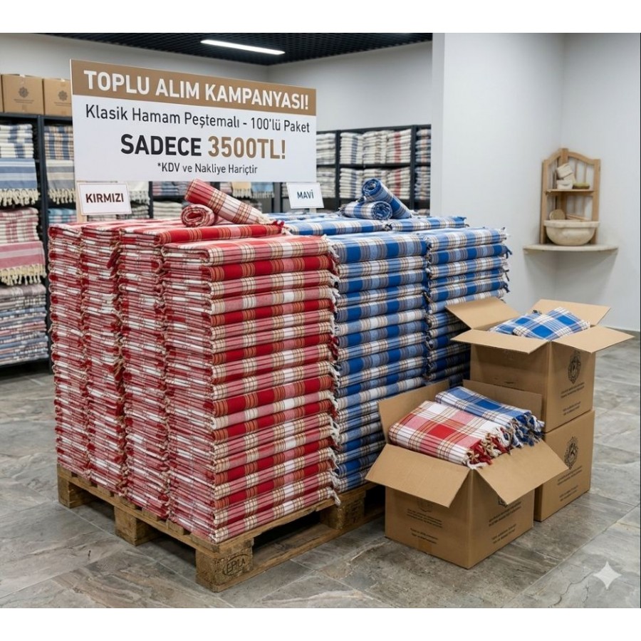 Klasik hamam peştemalı 100 adet paket; oteller, hamamlar, spa merkezleri ve toplu kullanım gerektiren işletmeler için ideal ekonomik çözümdür.