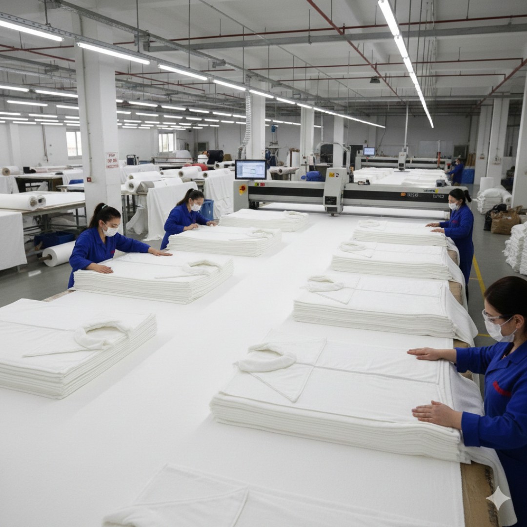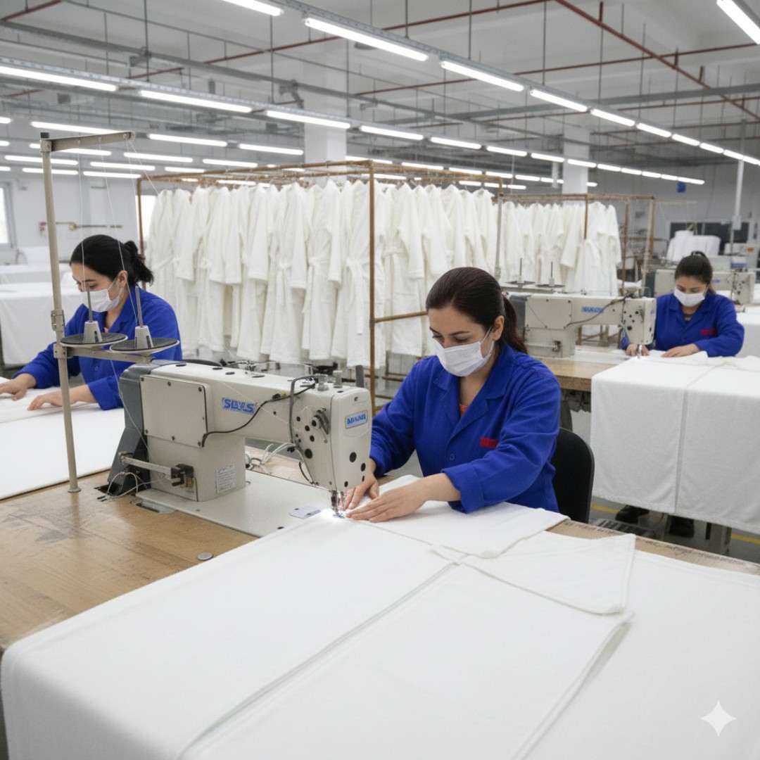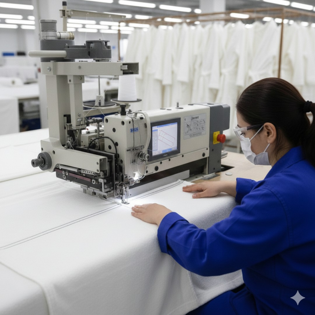 Toptan bornoz üretiminde seri dikim hatları, iş akışını hızlandırır ve maliyeti düşürür. Denizli ve Buldan bölgesinde bornoz dikimi yapan üreticiler, bu sistem sayesinde yüksek adetli siparişleri kısa sürede teslim edebilir.
