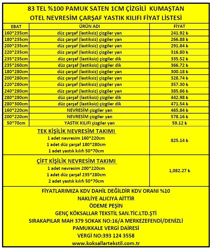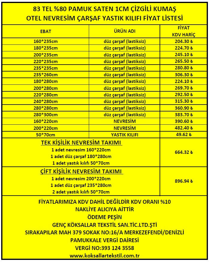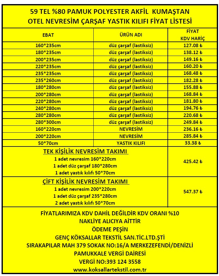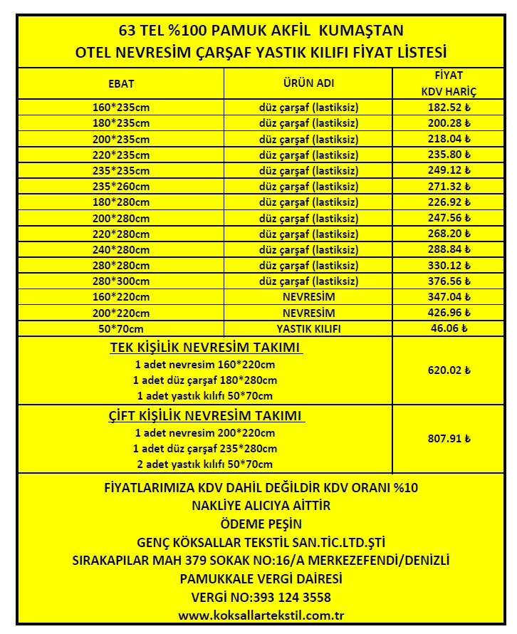 Fiyat listenizi nasıl alabilirim? İhtiyaç duyduğunuz ürünlerin adet, ölçü ve tel sayısı bilgilerini ilettiğinizde, ekibimiz size özel güncel otel tekstili fiyat listesi çalışmasını hızlıca hazırlamaktadır.